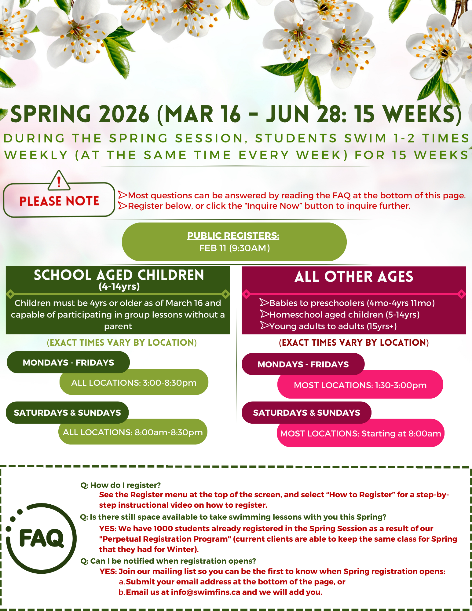 We encourage participants to swim 2x weekly whenever possible for the full session. We update our schedule often with new openings. Check back often.